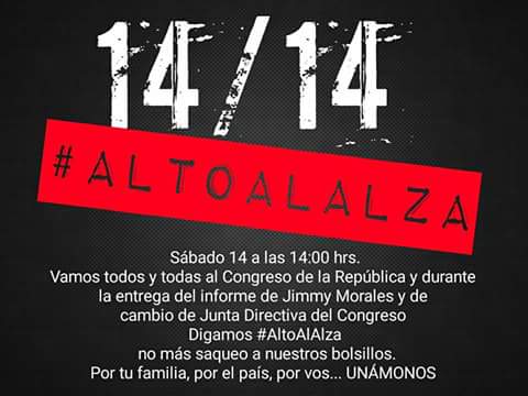 Se ha convocado a una manifestación este 14 de Enero del 2017 a las 14:00 horas cuando el Presidente de Guatemala, Jimmy Morales presente su Primer Informe de Gobierno ademas en contra de los cambios que se tendrán con la Nueva Junta Directiva del Congreso de la República de Guatemala.